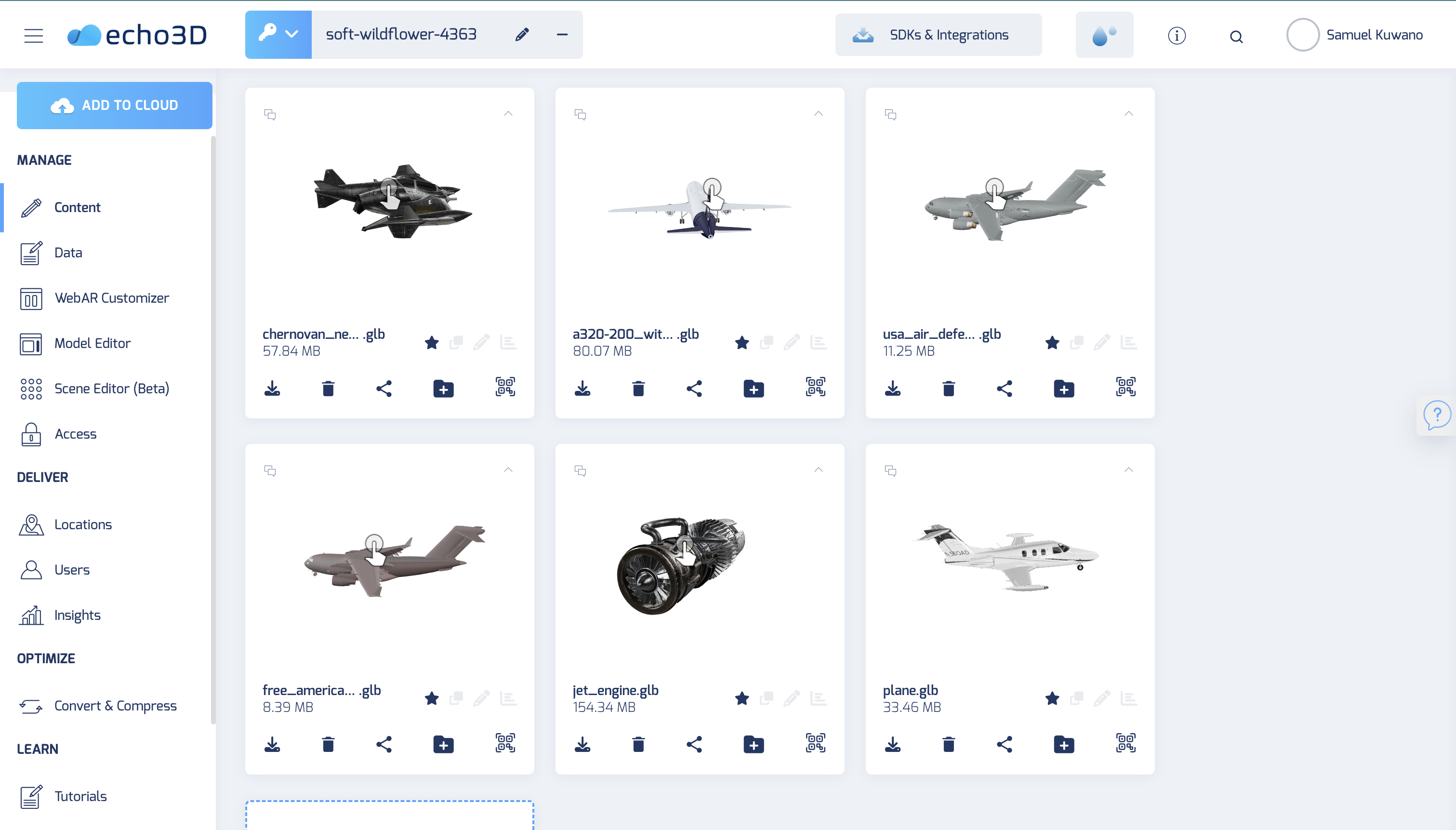 echo3D helps companies move their 3D assets to the cloud, allowing them to reduce their app size, update 3D content remotely, and stream new updates in real-time to different platforms, without the need to re-develop or re-deploy their app. In addition, every user gets access to these valuable time & cost-savings features: